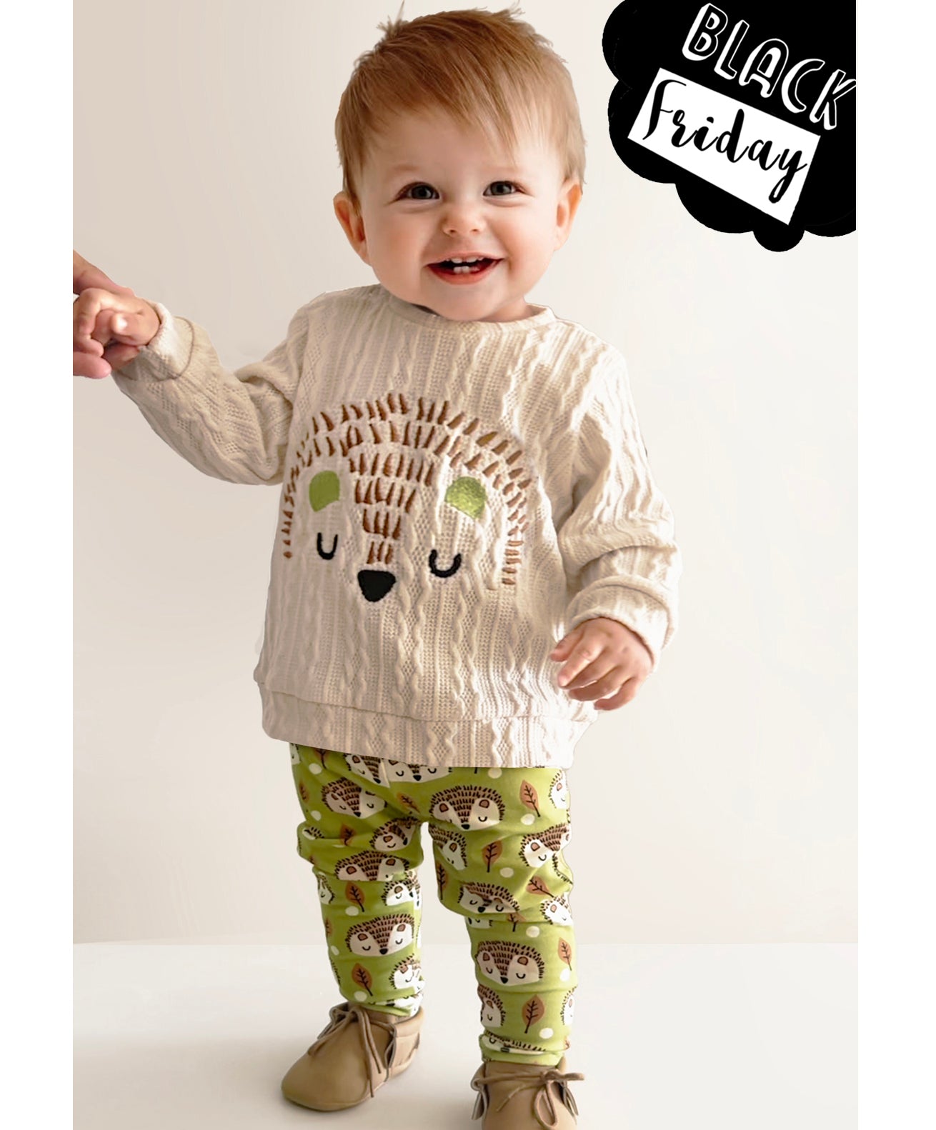 Conjunto de bebé de bebé unisex de jersey color beige con un erizo bordado y pantalones con print de erizos en fondo verde macha. Dispone de corchetes en el cuello para facilitar el cambio.