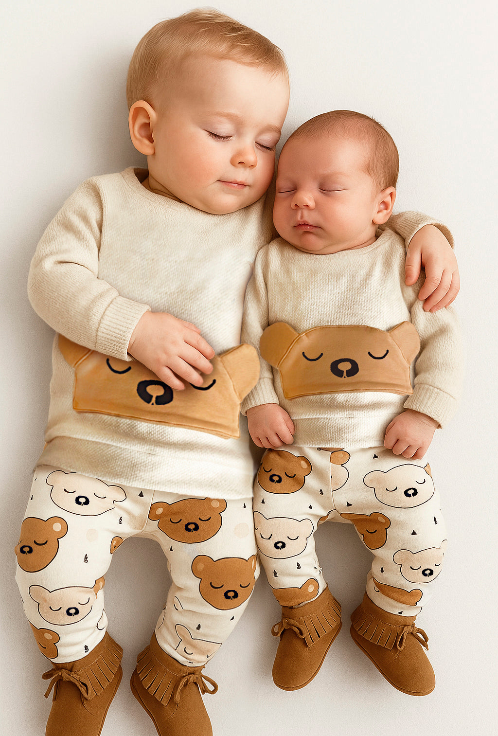 Conjunto de bebé de jersey con bolsillo de oso y pantalones estampados. Dispone de corchetes en el cuello para facilitar el cambio.