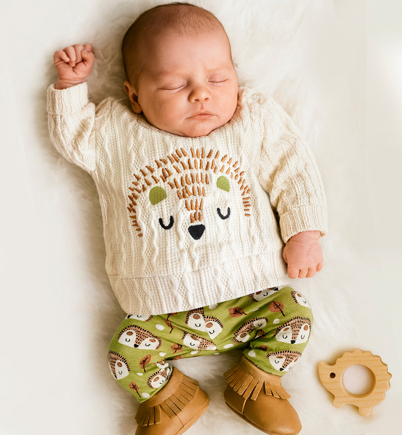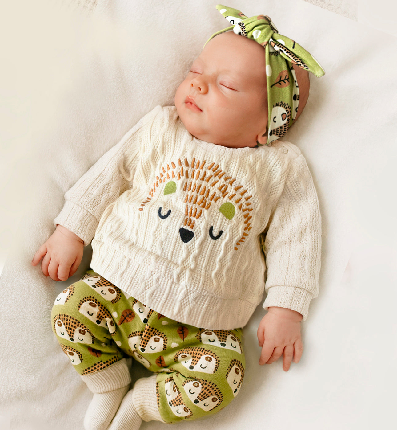 Conjunto de bebé de bebé unisex de jersey color beige con un erizo bordado y pantalones con print de erizos en fondo verde macha. Dispone de corchetes en el cuello para facilitar el cambio.