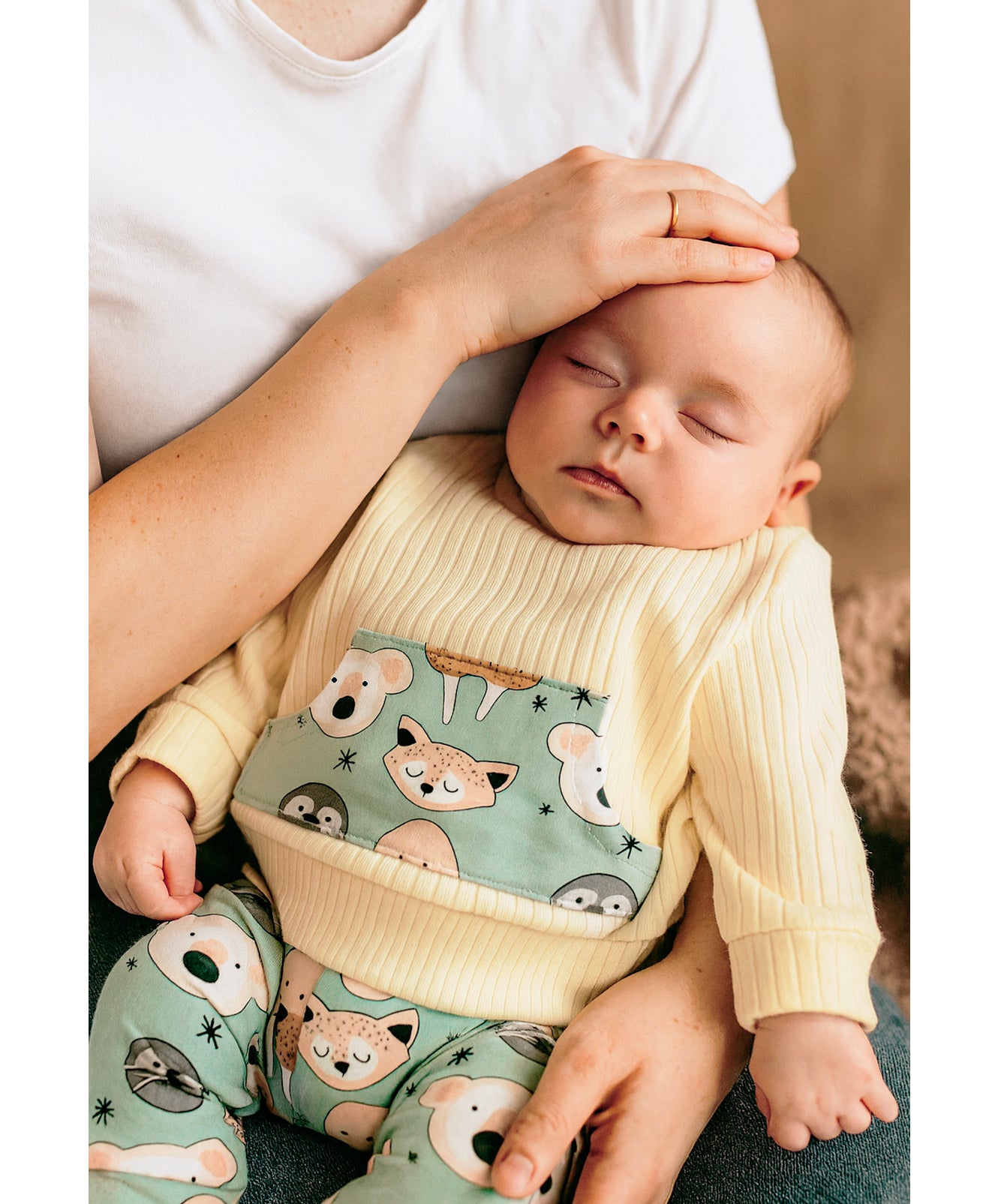 Conjunto de bebé de jersey color crema con bolsillo y pantalones con print de animales del ártico en fondo mint. Dispone de corchetes en el cuello para facilitar el cambio.